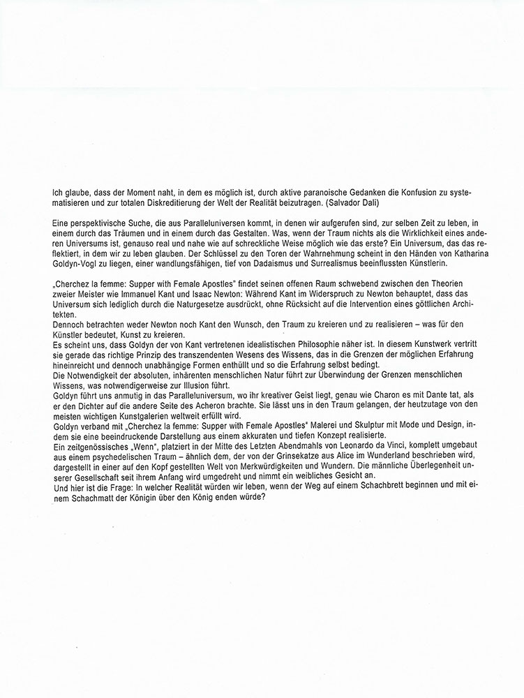 Ein zeitgenössisches „Wenn“, platziert in der Mitte des Letzten Abendmahls von Leonardo da Vinci, komplett umgebaut aus einem psychedelischen Traum – ähnlich dem, der von der Grinsekatze aus Alice im Wunderland beschrieben wird, dargestellt in einer auf den Kopf gestellten Welt von Merkwürdigkeiten und Wundern. Die männliche Überlegenheit unserer Gesellschaft seit ihrem Anfang wird umgedreht und nimmt ein weibliches Gesicht an.