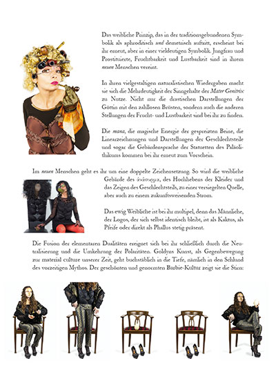 Man sieht deutlich , dass sich Goldyn von der klassischen Kunst losgesagt hat. Im Vegetativen hat sie eine neue Orientierung gefunden. In ihren Werken gibt es keinen klassische Geometrie mehr. Die Zweige, die Stacheln, das Gestrüpp, die Kakteen, all das sind die Bausteine einer neuen Welt . Sie streut uns Erde hin, und fordert uns auf, ihr in ihre unverbrauchte Welt zu folgen. Letztendlich ist Goldyns Wald ein neuer Weltkörper. Dort hat sie ein neues Menschenbild geschaffen. Bei ihr gibt es keinen Baum der Erkenntnis, sondern nur den Wald an sich. Dort, im utopischen Raum von Goldyn , ist die Sexualität nicht mehr nur gesellschaftliche Polarität. Der Garten von Eden ist bei ihr zu einer anderen Utopie geworden. Es ist ein wilder Ort voller Licht und Dunkelheit, wo Mann und Frau unkenntlich und untrennbar und doch zur Einheit verschmolzen, gemeinsam leben.